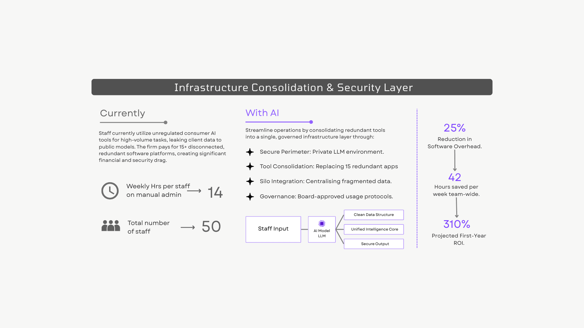Veronix deployed a four-stage Infrastructure Diagnostic to map the company’s current state and engineer a path to autonomy. 1. Staff Infiltration & Workflow Mapping: We conducted blind interviews with department heads and junior staff to uncover "informal automation". This allowed us to identify exactly where AI was already providing value and where it was creating risk. 2. Silo Identification & Tool Consolidation: We audited every active subscription, identifying five redundant tools that could be eliminated. We mapped the data silos—where lead information was "trapped"—to design a unified data core. 3. Governance & Security Engineering: Veronix designed a "Protected Perimeter" for AI usage—a secure, private environment where staff could use the power of LLMs without data ever leaving the firm’s control. 4. The Final 24-Month Roadmap: We delivered a technical blueprint that categorized every required upgrade by priority, giving leadership a board-approved schedule for infrastructure deployment. ---------- Engineered Market Advantage: The audit shifted the company's culture from defensive fear to offensive velocity. The firm is no longer "reacting" to AI; they are building on top of it. - Financial Reclamation: The identified tool redundancies immediately saved the firm 25% in monthly software overhead, effectively self-funding the first year of their AI roadmap. - Risk Elimination: By formalizing AI usage into a secure, managed layer, the firm eliminated the legal and security risks associated with Shadow AI. - Operational Continuity: The firm secured its position in the market by transitioning from a manual-heavy model to an AI-ready infrastructure, ensuring it can scale without adding headcount. - Board-Level Certainty: Leadership now operates with a clinical roadmap, replacing the "fear of the unknown" with a structured engineering plan. NOTE: AI is a tool, just like an engine. If used incorrectly, things can break.
